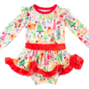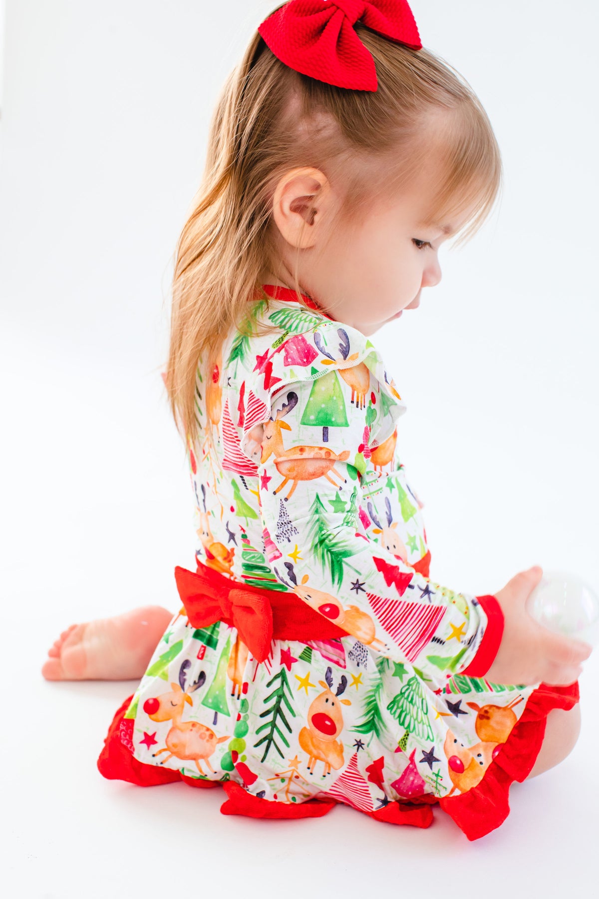 Ruffle shoulder, velvet trim and bow detail, and adorable reindeer make this the sweetest holiday dress for your baby!