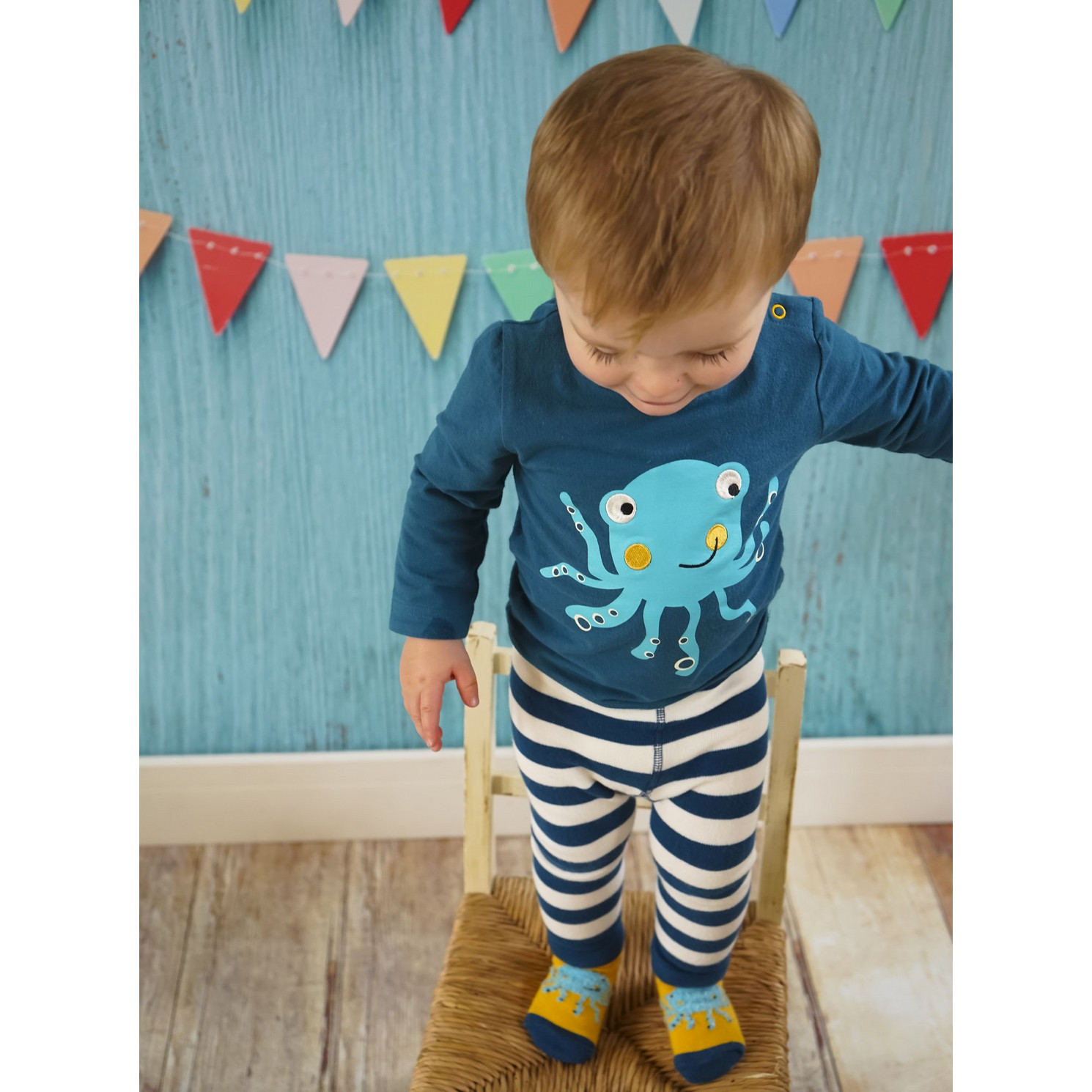 Cool long sleeve dusty blue top with funky octopus character on the front.