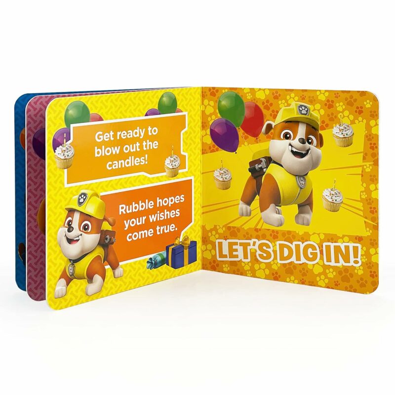 Birthday card that’s a board book has big flap on cover to write names and birthday wishes! Kids who love Paw Patrol will read this birthday greeting book again and again! Bring a book instead of a card! Includes favorite Paw Patrol Pups Chase, Marshall, Skye, and Rubble. Great for a Paw Patrol birthday party for any age boy or girl. Open the front cover flap to personalize the birthday book. Make it a Happy Pawsome Birthday!
