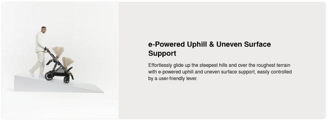 The e-Gazelle is a stroller for all your adventures ahead! The CYBEX e-Gazelle stroller combines adaptability and convenience with the electric power of smart technology. Conquer any uphill climb or downhill descent and cruise through any uneven terrain effortlessly with the assistance of our electronic power on demand. Adapting to the changing needs of your family, the e-Gazelle is designed to support 20+ different configurations and easily converts from a single to double stroller. Whatever your plans are for the day, you can rely on the shopping basket and spacious lower basket for up to 55lbs. of groceries or any essentials for the journey ahead. After a long busy day, use our gentle rocking feature to help calm and soothe your child.