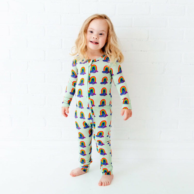 The Slumber Over The Rainbow bamboo viscose zippy is designed to last twice as long as the average footie, due to the extra length and super stretchy fabric. And the best part, this convertible footie is made up to size 4T so your toddler and baby can match!
