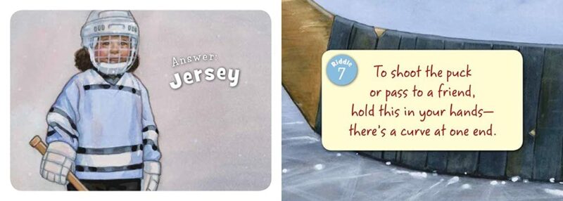 “Round and black–do you know its name? You need this disk to play the game.” Answer: Puck. Now even the smallest of fans can enjoy a book about their favorite sport. Rhyming riddles accompanied by colorful artwork help introduce the game’s simplest, most basic elements.