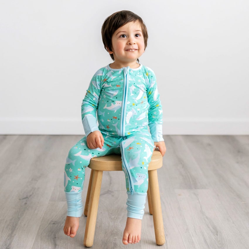 Sharks Soiree Little Sleepies are the perfect staple for your sweet little one’s wardrobe! With adorably happy sharks on the most beautiful aqua color, the Sharks Soiree Zippy will quickly become a bedtime favorite. Little Sleepies Sharks Soiree Zippy also features foldover foot cuffs that allow you to convert to a romper or a sleeper.