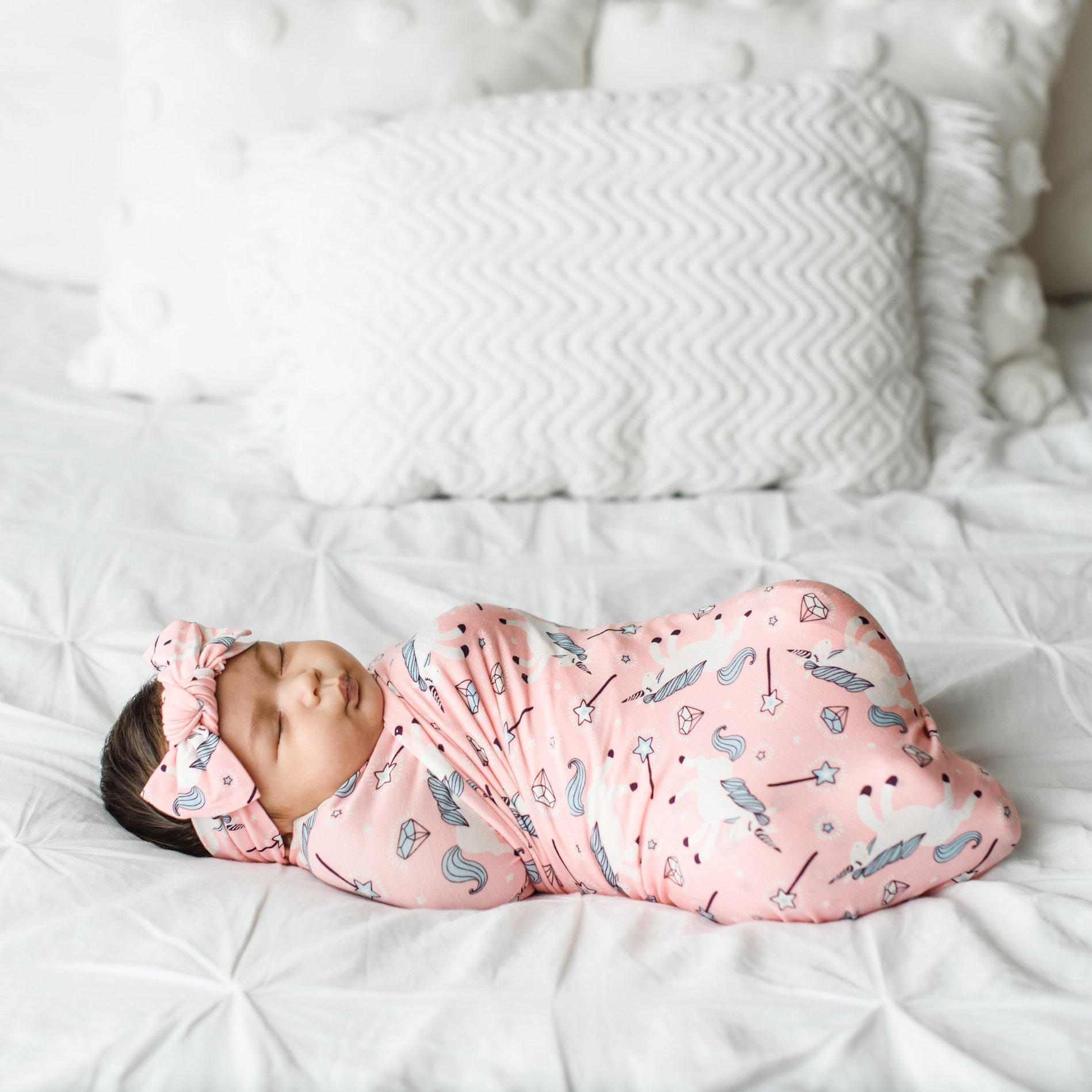 Wrap your newborn little sleepy in the super-soft bamboo Unicorn Swaddle Set from Little Sleepies! The set includes a comfy swaddle blanket and matching knotted hat, perfect for pictures in the hospital, and to keep your new little one cozy while they sleep.