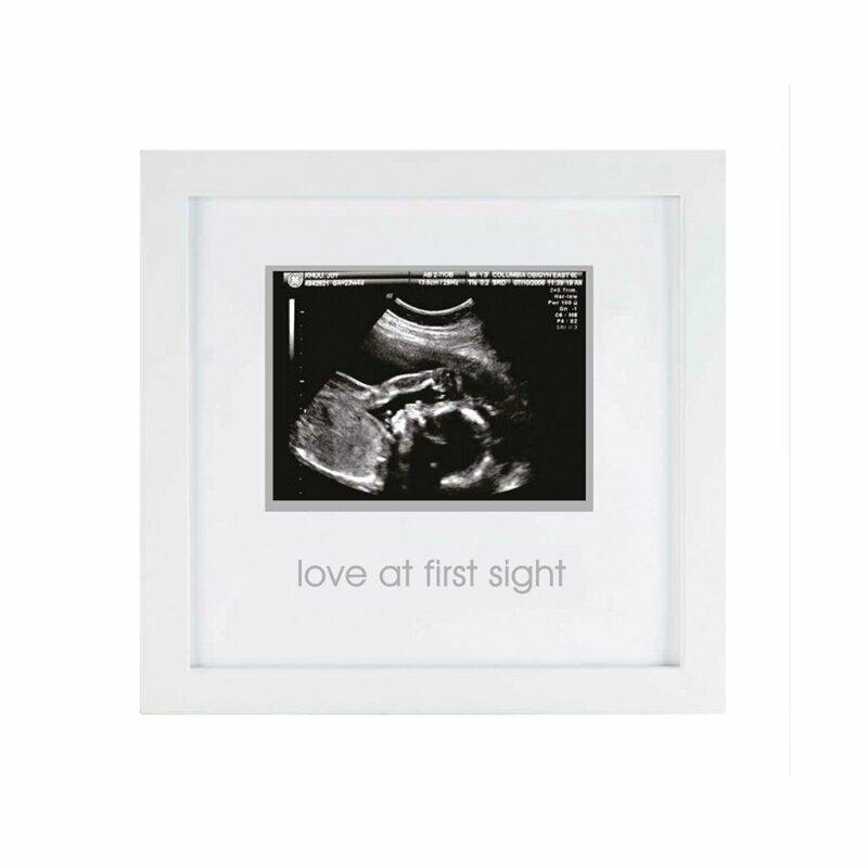 There’s no feeling like seeing your bundle of joy for the first time. Pearhead’s sonogram frame is the perfect keepsake for always cherishing that special moment and your little one. This modern, white wooden frame holds a 3” x 4” sonogram picture. An acid-free beveled mat is included to border the sonogram picture. “Love at first sight” is silver foil stamped on the acid-free beveled mat adding an adorable touch to this keepsake frame. This frame is perfect for setting on any table or desk with the included easel. Or hang the frame in your home with the included sawtooth hanger.