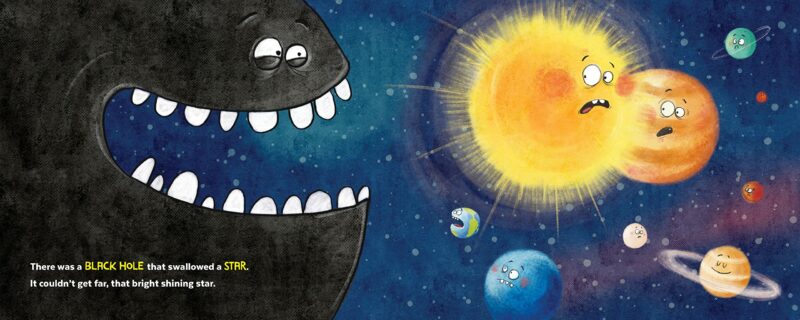 Using the familiar rhythm of “There Was an Old Lady Who Swallowed a Fly,” follow along as the black hole swallows up the universe and everything that exists in it, from the biggest to the smallest pieces of matter. The silly, vibrant artwork is sure to make stargazers of all ages smile and start a love of science in your baby.